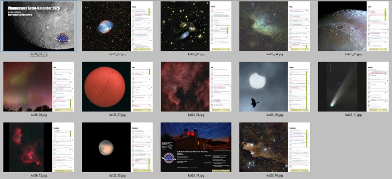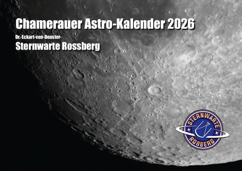 Aus aktuellem Anlass - ab Ende November 2025 ist der "Chamerauer Astro-Kalender 2026" der Sternwarte Roßberg wieder erhältlich! Er enthält wie gehabt alle bayern- und bundesweiten Feiertage, Schulferien, astronomischen Ereignisse, Veranstaltungen der Sternwarte Roßberg, Chamerauer Vereinsveranstaltungen, und vieles mehr.